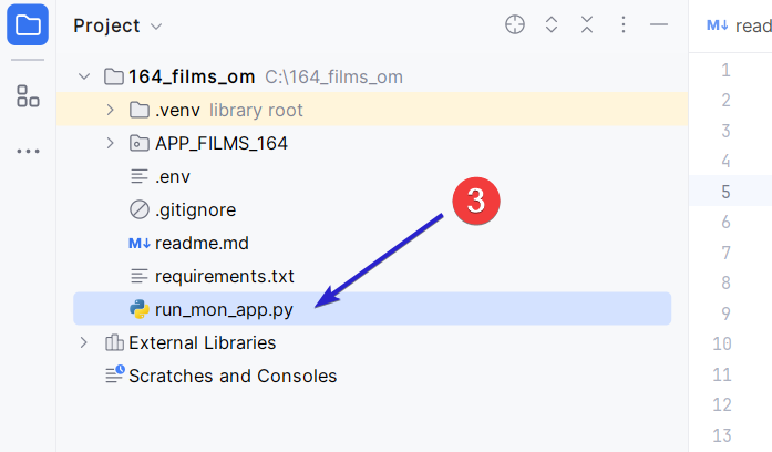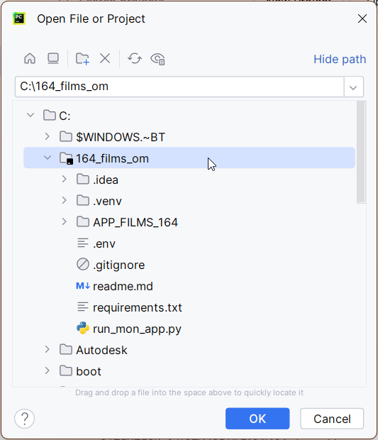 Vous pouvez maintenant ouvrir PyCharm et Menu « File »–> « Open project », observez la structure des fichiers en dessous du répertoire « 164_films_om » il faut que le répertoire « .venv » soit présent.